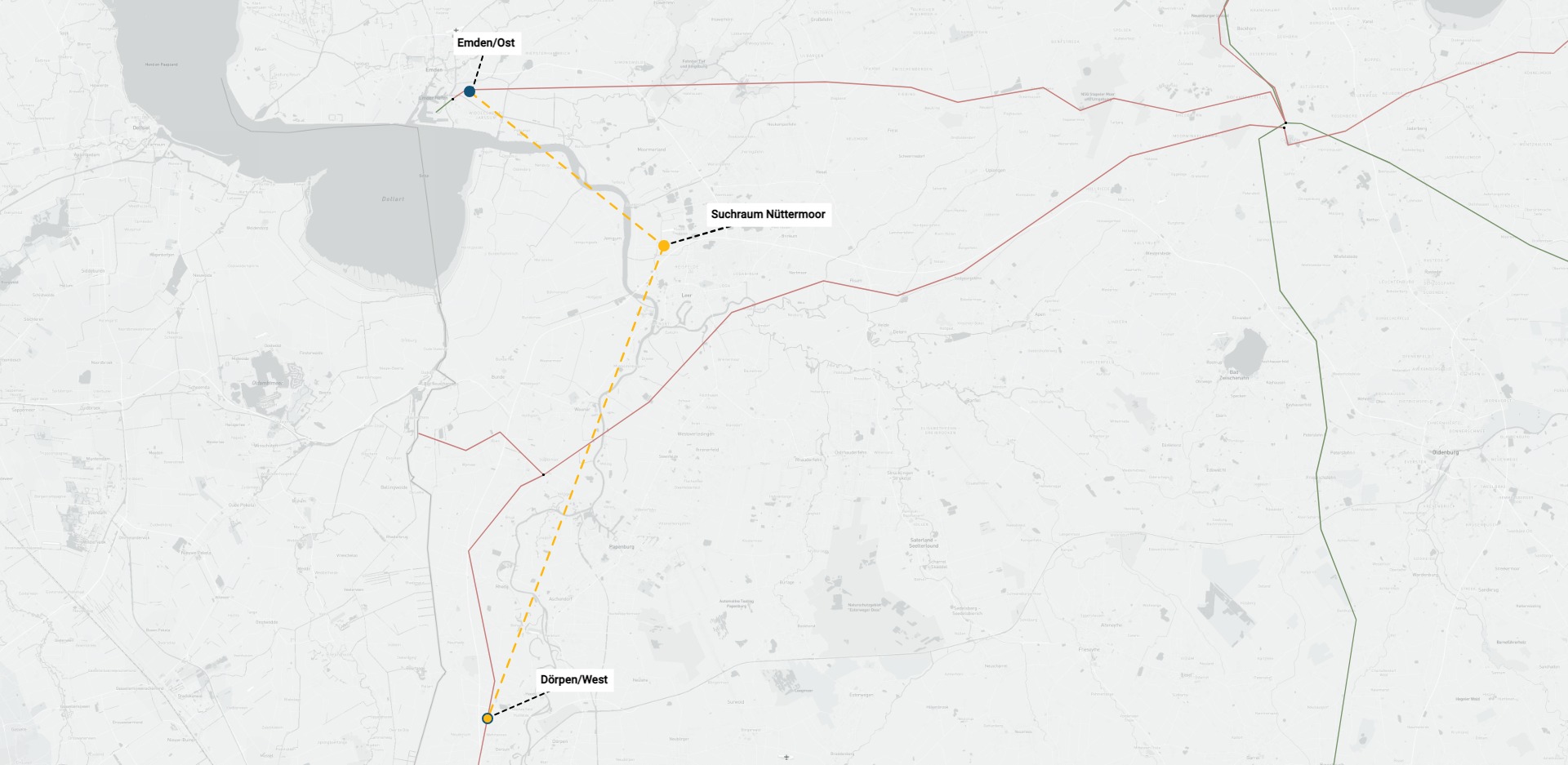 Zwischen Emden/Ost, Suchraum Nüttermoor und Dörpen/West existiert noch keine Infrastruktur auf der Höchstspannungsebene, die verstärkt werden könnte. Daher ist ein Neubau in neuer Trasse erforderlich.