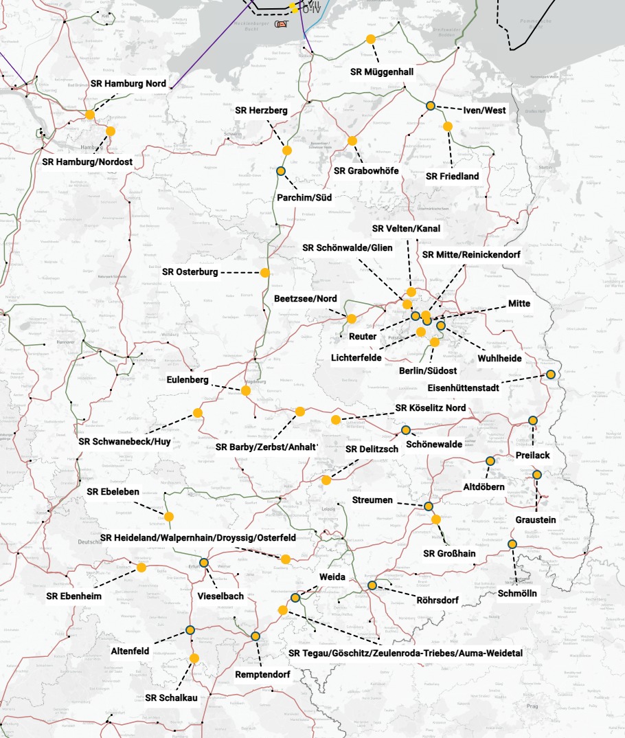 • M595 b2), i) bis k), m) bis q) und t) bis y): Blindleistungskompensationsanlagen an weiteren Standorten der 50Hertz-Regelzone: Das netztechnische Ziel der Maßnahmen ist es, in den folgenden Umspannwerken stufenlos regelbare Blindleistung mit der regelungstechnischen Option zur Integration von statischen Kompensationsanlagen für die Spannungshaltung in der jeweiligen Netzregion bereit zu stellen. Hierfür sind zudem Anpassungen der 380-kV-Anlagen der Standorte notwendig (ausgenommen sind Neubau-UW). Die Kurzzeitspeicheranlagen werden technisch möglichst eng an den bzgl. der Frequenzstabilität ermittelten minimalen Anforderungen spezifiziert. Dies erfordert einen hohen Wirkleistungsbeitrag (≤ 300 MW) und einen Energiespeicher von ca. 4 MWs pro MW.